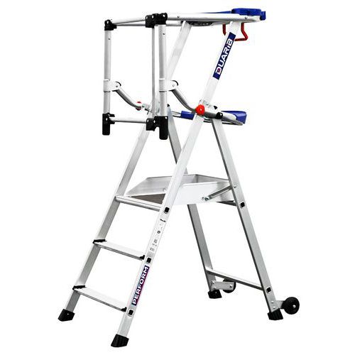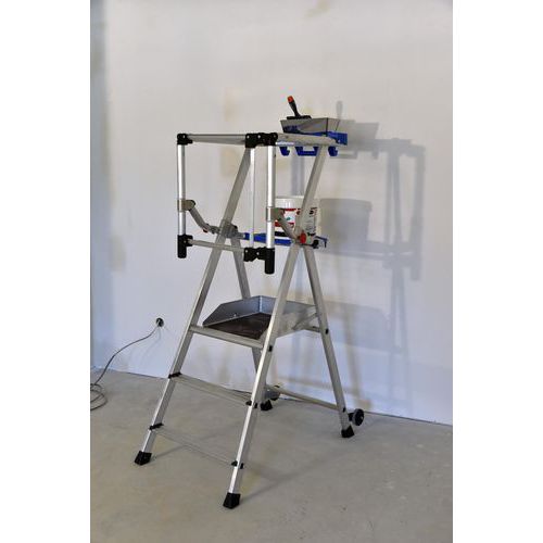 Plate-forme individuelle fixe autostable nouvelle génération en aluminium. Installation rapide et aisée avec mise en place des garde-corps en 1 seul geste. Haute sécurité avec protection arrière par garde-corps articulé et accrochage automatique. Plate-forme confortable et efficace avec 2 tablettes en série à compartiments. Marches largeur 80 mm pour un accès ultra confort. Tablette supérieure grande capacité. Forme incurvée pour travailler au plus près du mur. 2 crochets porte-seau. Poignée de transport intégrée. Tablette inférieure adaptée pour fût de 15 litres. Charge maxi (kg) : 150 kg Garantie client : 5 ans