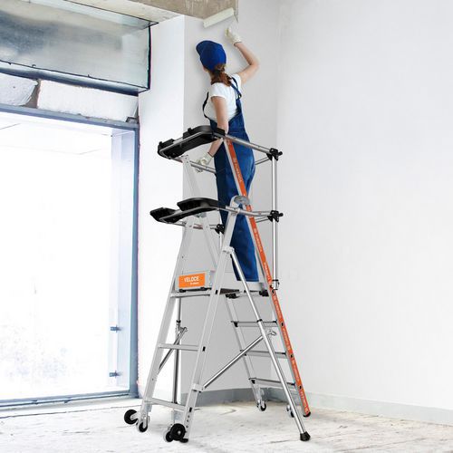 Veloce Lisses est la référence des plate-formes individuelles de travail. Légère, compacte et ultra-mobile, cette plate-forme se glisse partout sur les chantiers. Sécurité maximale : Veloce répond à toutes les exigences de sécurité françaises et européennes. Confort de l'utilisateur : cette plate-forme est munie de deux tablettes amovibles. La tablette basse résiste à 25 kg et dispose d'un espace pensé pour accueillir aisément des fûts de peintures ou du gros matériels. Garde-corps rigide 4 côtés avec lisses de protection antichute à fermeture semi-automatique. Roues escamotables 75 mm pour une mobilité rapide et optimale. Marches antidérapantes 80 mm. Porte-outils compartimenté amovible, résistance 25 kg, avec crochets intégrés (maxi 10kg). Tablette XL résistance 25 kg. Plancher 500 x 400 mm antidérapant en bois éco-sourcé avec verrou automatique. Espace de travail ergonomique. Stabilisateurs rétractables à réglage millimétrique. Roues de transport Ø 100 mm (2 à 6 marches), Ø 175 mm pour le 7 marches.
