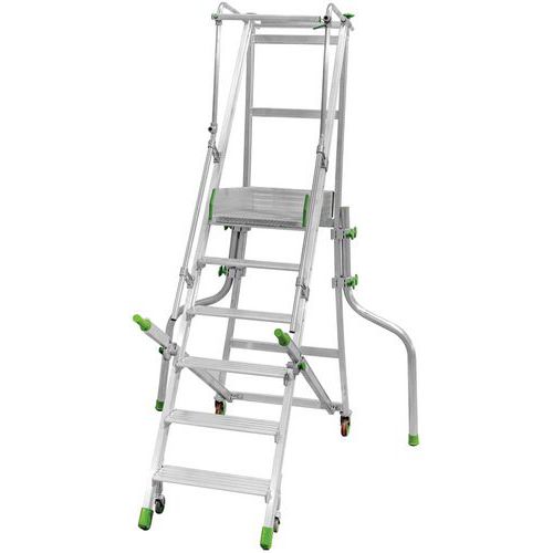 Plate-forme mobile ergonomique simple à déplacer avec poignées pliables. Angle de montée de 60° pour une utilisation facile et sécurisée. Confort et sécurité avec plate-forme en tôle de diamant. Marches grandes et larges, antidérapantes. Plate-forme avec porte-outils amovible. Escalier repliable, facile à ranger. La barre de sécurité qui se trouve sur le garde corps, est actionnée par un levier et s'ouvre à la verticale.