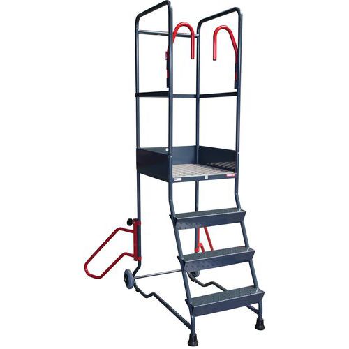 Grande stabilité grâce à la large plate-forme et aux 2 stabilisateurs. Plateforme supérieure en tôle larmée antidérapante. Structure en acier mécano soudé et finition époxy. Sécurité assurée par le garde-corps et les plinthes sur 3 côtés.