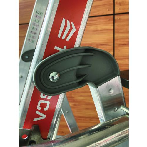 Plate-forme mobile Veloce. Garde-corps rigide 3 côtés avec sangles de protection antichute arrière. Roues escamotables pour une mobilité rapide et optimale. Marches antidérapantes de 80 mm. Porte-outils compartimenté amovible résistance 25 kg avec crochets intégrés (maxi 10kg). Plancher 500 x 400 mm antidérapant en bois éco-sourcé. Espace de travail ergonomique. Stabilisateurs rétractables à réglage millimétrique.
