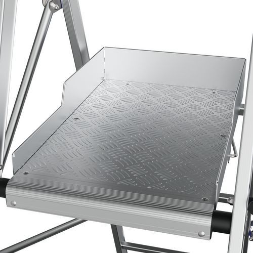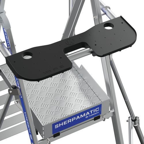 Plateforme de travail Sherpamatic, robuste et confortable avec garde corps Saloon. Garde-corps rigide 4 côtés avec portillon type Saloon à fermeture automatique. Marches antidérapantes 80 mm. Porte-outils compartimenté amovible, résistance 25 kg, avec crochets intégrés (maxi 10kg). Tablette XL résistance 25 kg. Stabilisateurs rétractables à réglage millimétrique. Plancher grand confort 600 x 400 mm antidérapant en aluminium. Espace de travail confortable et ergonomique.