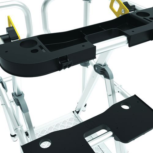 Plateforme de travail Sherpamatic, robuste et confortable avec garde corps Saloon. Garde-corps rigide 4 côtés avec portillon type Saloon à fermeture automatique. Marches antidérapantes 80 mm. Porte-outils compartimenté amovible, résistance 25 kg, avec crochets intégrés (maxi 10kg). Tablette XL résistance 25 kg. Stabilisateurs rétractables à réglage millimétrique. Plancher grand confort 600 x 400 mm antidérapant en aluminium. Espace de travail confortable et ergonomique.