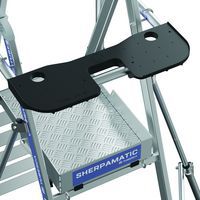 Plateforme de travail Sherpamatic, robuste et confortable avec garde corps Saloon. Garde-corps rigide 4 côtés avec portillon type Saloon à fermeture automatique. Marches antidérapantes 80 mm. Porte-outils compartimenté amovible, résistance 25 kg, avec crochets intégrés (maxi 10kg). Tablette XL résistance 25 kg. Stabilisateurs rétractables à réglage millimétrique. Plancher grand confort 600 x 400 mm antidérapant en aluminium. Espace de travail confortable et ergonomique.