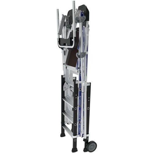 Plate-forme Sherpascopic lisse à Garde-corps pliant rigide 4 côtés permettant une plus grande compacité. Lisses à fermeture semi-automatique. Plancher grand confort antidérapant en bois. Stabilisateurs rétractables à réglage millimétrique. Plans télescopiques permettant le décalage de niveau. Système de réglage tous les 23cm de la hauteur intuitif et sécurisé. Marches antidérapantes 80 mm (plan fixe) et 60 mm (plan télescopique). Porte-outil compartimenté amovible à résistance 25 kg, avec crochets intégrés (maxi 10kg).