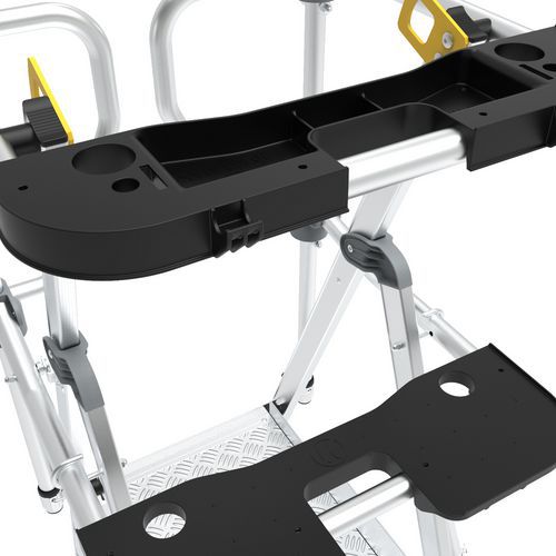 Plate-forme Sherpascopic Saloon. Garde-corps rigide 4 côtés avec portillon type Saloon à fermeture automatique. Marches anti-dérapantes 80 mm (plan fixe) et 60 mm (plan télescopique). Porte-outils compartimenté amovible, résistance 25 kg, avec crochets intégrés (maxi 10kg). Tablette XL résistance 25 kg. Plancher grand confort 590 x 400 mm antidérapant en aluminium. Espace de travail ergonomique et confortable. Stabilisateurs rétractables à réglage millimétrique. Système de réglage de la hauteur intuitif et sécurisé, réglage tous les 23 cm. Plans télescopiques permettant le décalage de niveau.