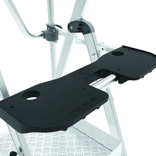Plate-forme Sherpascopic Saloon. Garde-corps rigide 4 côtés avec portillon type Saloon à fermeture automatique. Marches anti-dérapantes 80 mm (plan fixe) et 60 mm (plan télescopique). Porte-outils compartimenté amovible, résistance 25 kg, avec crochets intégrés (maxi 10kg). Tablette XL résistance 25 kg. Plancher grand confort 590 x 400 mm antidérapant en aluminium. Espace de travail ergonomique et confortable. Stabilisateurs rétractables à réglage millimétrique. Système de réglage de la hauteur intuitif et sécurisé, réglage tous les 23 cm. Plans télescopiques permettant le décalage de niveau.