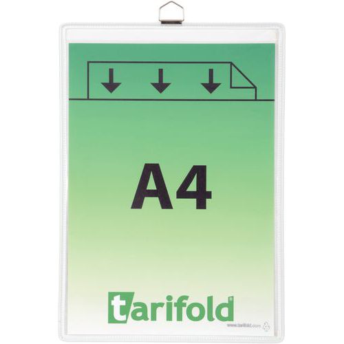 Poche à anse - A4 - portrait - petit coté. Une solution à suspendre pratique pour exposer facilement tout type de document. Anse métal chromé intégrée. Pour un affichage portrait. Ouverture petit coté avec insertion par le haut Disponible en plusieurs formats et couleurs. Le cadre en fil d'acier exclusif Tarifold renforce la poche et lui permet de résister à un usage quotidien intensif. Le cadre coloré met en valeur l'information et la rend identifiable. Qu'il s'agisse d'afficher des documents ISO, des informations sur la qualité, des horaires, des prix, des schémas ou des menus. les utilisations de cette poche à suspendre sont infinies.