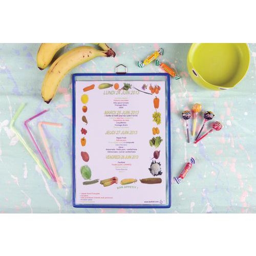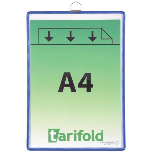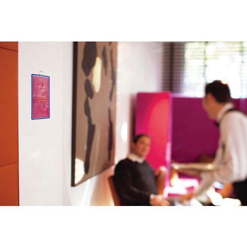 Pochette d'affichage à accrocher pour documents A3, orientation portrait. Cadre fil d'acier incassable TARIFOLD. Coloris attrayants permettant un affichage thématique. Surface transparente antireflets. Anse métallique chromée très résistante. pour fixation au mur. Solution pratique pour afficher et encadrer tout type de documents A3. Idéale pour l’affichage en entreprise, sur les points d’information, dans les lieux publics, les couloirs, les halls d’accueil. Pour l'affichage de documents permanents (horaires, réglements, sécurité, évacuation, instruction hygiène...)