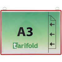 Pochette d'affichage à accrocher pour documents A3, orientation portrait. Cadre fil d'acier incassable TARIFOLD. Coloris attrayants permettant un affichage thématique. Surface transparente antireflets. Anse métallique chromée très résistante. pour fixation au mur. Solution pratique pour afficher et encadrer tout type de documents A3. Idéale pour l’affichage en entreprise, sur les points d’information, dans les lieux publics, les couloirs, les halls d’accueil. Pour l'affichage de documents permanents (horaires, réglements, sécurité, évacuation, instruction hygiène...)