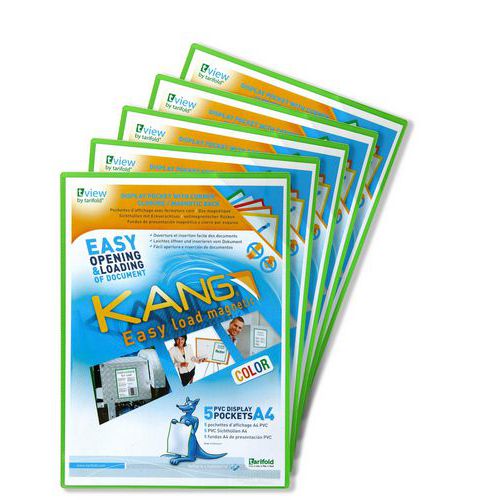 Pochettes d'affichage magnétique Kang Easy Load se fixe sur toutes les surfaces métalliques. Dos entièrement magnétique, tenue irréprochable. Ouverture sur 2 côtés pour une insertion facile des documents. Fermeture coin Easy load : pratique et efficace pour insérer et extraire les documents. Installation simple et rapide, sans vis ni clou, se retire sans laisser de traces. Utilisation portrait et paysage. Solution d'affichage à utiliser sur les machines, portes, tableaux métalliques, réfrigérateurs… Poche en PVC avec dos magnétique. Peut contenir jusqu’à 10 feuilles de papier 80 g. Fonds entièrement vert.
