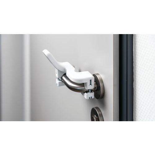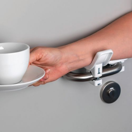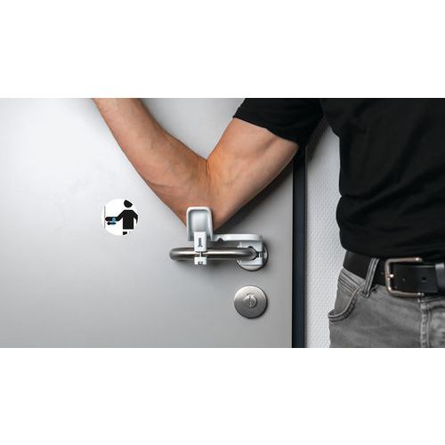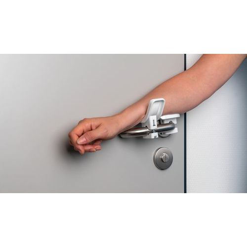 Important, ne pas installer sur porte coupe-feu (normes DIN 18273 et EN 1634) et issue de secours (normes EN 179 et EN 16034). Matériau ABS ignifugé conforme bâtiments publics (selon norme DIN 4102-1), résistant aux produits d’entretien et de désinfection, pas de détérioration. À fixer sur les poignées existantes, sans risque de les endommager.