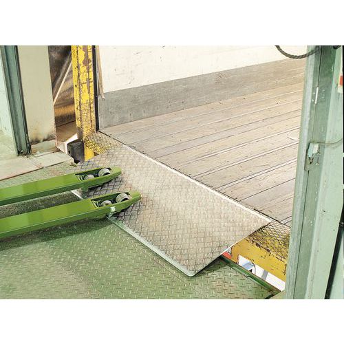 Pont de chargement PL, forme extra plate, pour le passage de matériels ayant de faible garde au sol. Adapté aux passages de transpalettes manuels et électriques, gerbeurs ayant de très faibles gardes au sol. Ailette centrale qui bloque le pont et évite tout risque de ripage. Blocage automatique entre le quai et le camion. Fabriqué en Allemagne Force (kg) : 1200 Garantie client : 3 ans