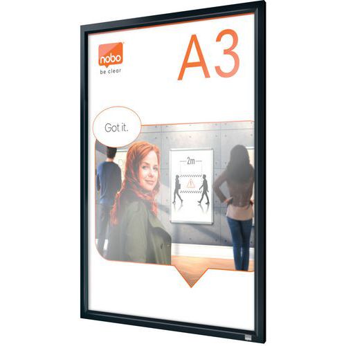 Porte-affiche mural est doté d'un élégant cadre clipsable extraplat de coins biseautés fluides et d'un mécanisme de remplacement de contenu vraiment innovant.