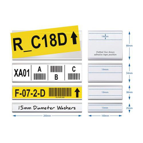 Porte-étiquette transparent. Permet la lecture des codes-barres sans extraire l’étiquette. Facilité d’utilisation. En tirant la face vers l’avant : introduire ou actualiser vos informations. Autoadhésif, pas de travail salissant avec de la colle. Fabriqué au RU Montage sans outils Secteur entrepôt