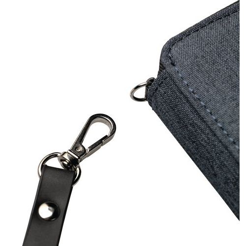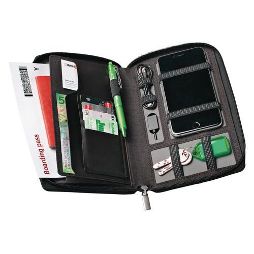Équipé de divers compartiments (cartes, passeport, smarthphone (6)...),d'une fermeture à glissière et d'une dragonne amovible.