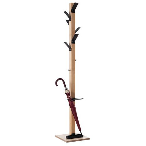 Fût en hêtre massif vernis, patères, porte-parapluie et coupelle colorés.