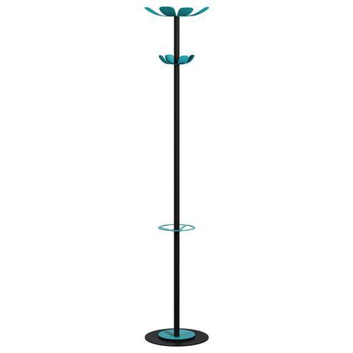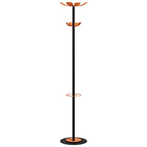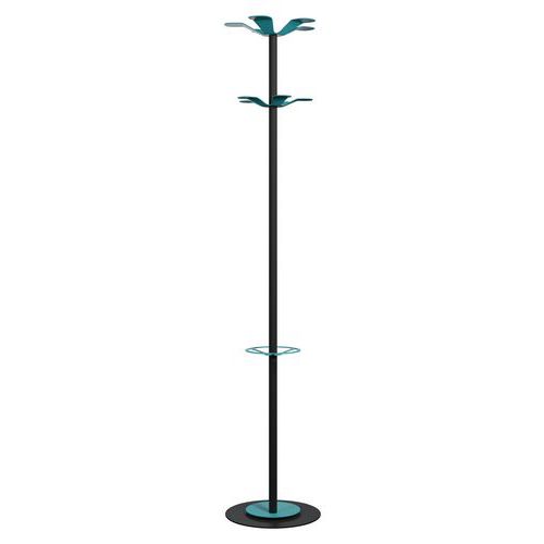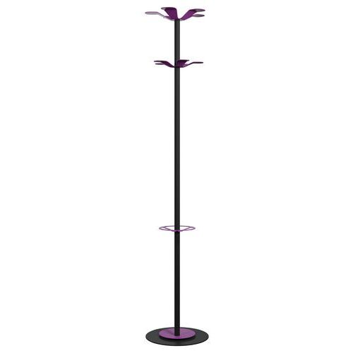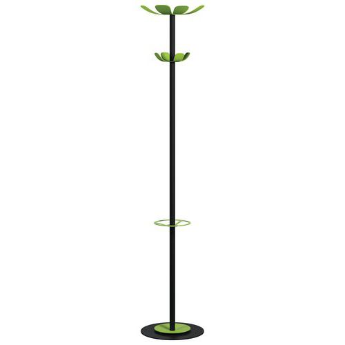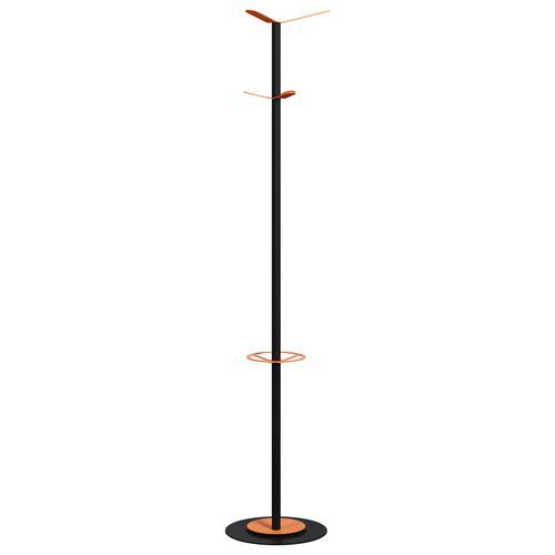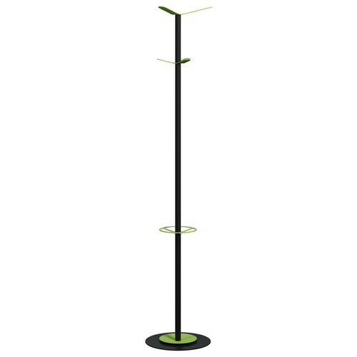 Tête : 6, 8, 10 ou 12 patères en acier, finition époxy Porteparapluies : en acier, finition époxy Coupelle de récupération d’eau : en acier, finition époxy Fût : en acier, diamètre 30 mm, finition époxy noir Base : en acier, diamètre 35 cm, finition époxy noir
