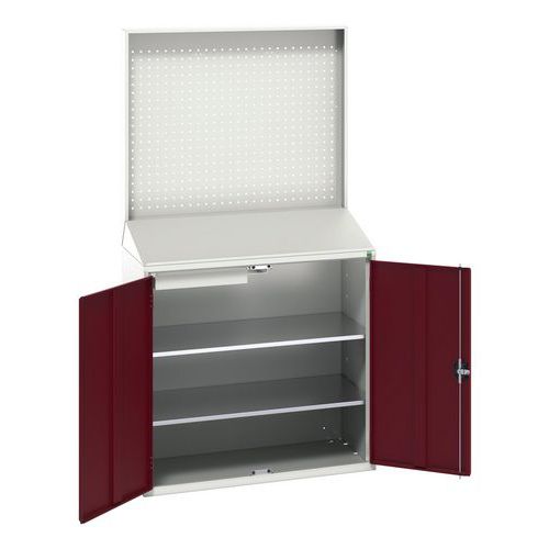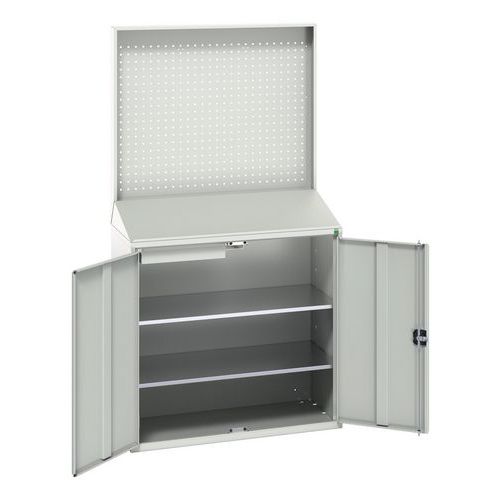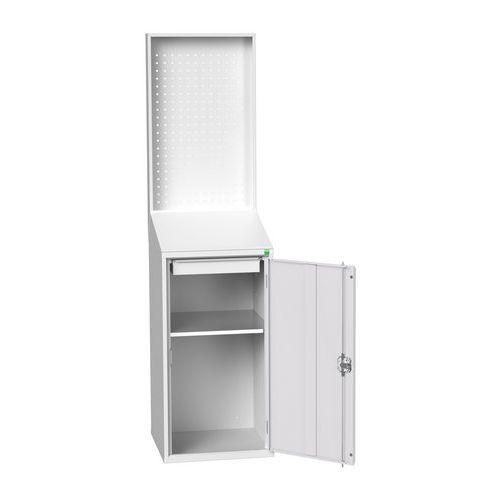 Poste de consultation équipé d’un panneau arrière perfo et d'une étagère haute. Surface d'écriture inclinée. Caisson bas équipé de 2 tablettes en acier galvanisé et d'1 tiroir. Double portes renforcées et poignées intégrées. Ouverture du tiroir à 100%. Fermeture par serrure. Fabriqué au RU