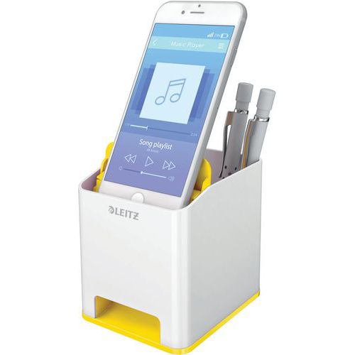 Pot à crayons avec amplificateur de son pour smartphone à la finition brillante, robuste et de qualité premium