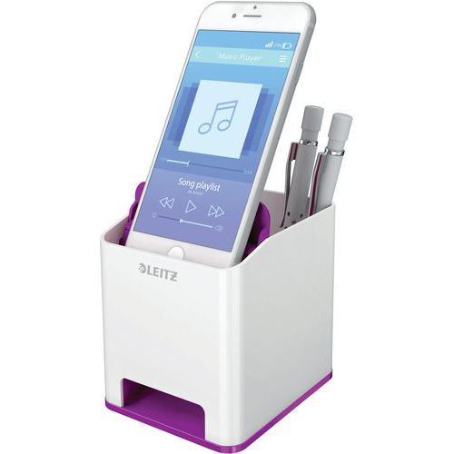 Pot à crayons avec amplificateur de son pour smartphone à la finition brillante, robuste et de qualité premium