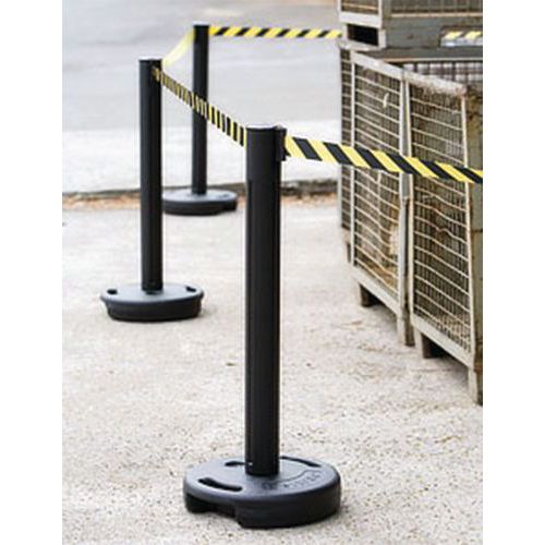 Poteau stable avec socle à lester avec eau, sable ou béton. Sangle rétractable autofreinée : revient doucement en cas de décrochage. Conçu pour répondre aux exigences des environnements professionnels.