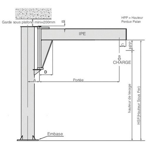 Construction mécano-soudée très robuste. Flèche en fer profilée IPE. Rotation du bras aisée sur bagues auto-lubrifiantes. Rotation 270°. Peinture jaune (RAL 1028). Disponible avec une portée de 2, 3, 4 ou 5 m. Autres portées : nous consulter. Hauteur sous fer limitée à 5 m en standard. Autres dimensions : nous consulter. Poids : selon modèle, nous consulter. Options possibles : ligne d'alimentation électrique, chariot porte-palan, palan électrique ou manuel, peinture spéciale, version mobile déplaçable, interrupteur cadenassable… Fixation sur massif béton par crosses d’ancrage (gabarit et crosses en option) ou fixation sur dalle béton par cheville chimique (en option) avec ou sans semelle de répartition (en option). Mise en place de la potence : prévoir 150 mm de garde sous le plafond. Mise en place et installation : nous consulter. Fabriqué en France Force (kg) : 500 kg