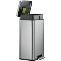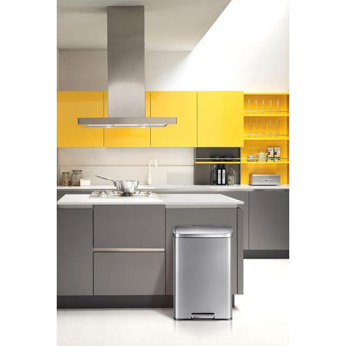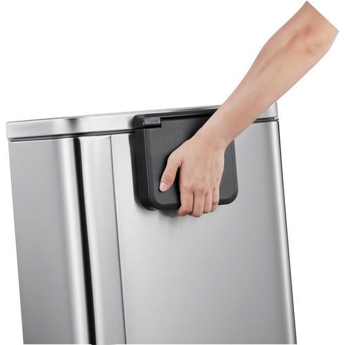 - Poubelle à pédale rectangulaire élégante en inox brossé avec revêtement anti-traces de doigts et couvercle à fermeture silencieuse.