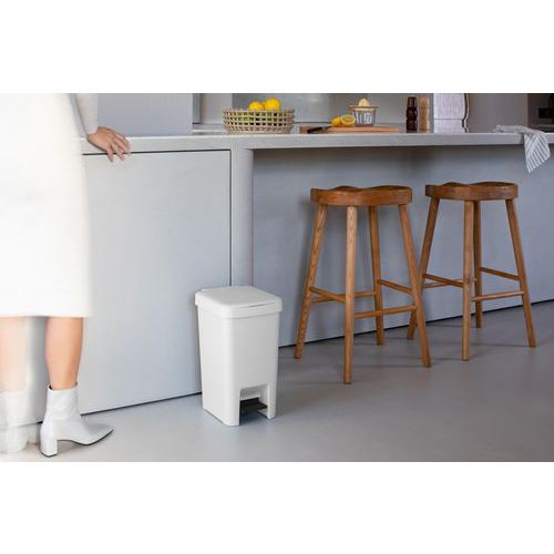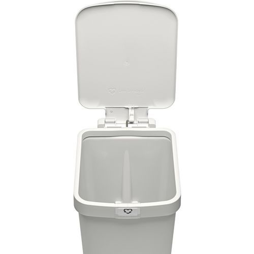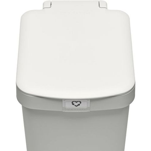 Poubelle circulaire à pédale en matière synthétique, composée à 91% de matériaux recyclés et recyclable à 99% après usage. Grâce à la conception étroite, cette poubelle est peu encombrante et pet être serrée étroitement contre le mur. Equipeé d'un couvercle à fermeture silencieuse, d'un porteétiquette pour indiquer le flux de déchets et d'un espace de rangement pratique pour les sacs poubelle. Couvercle à large bord qui maintient le sac hors de vue.