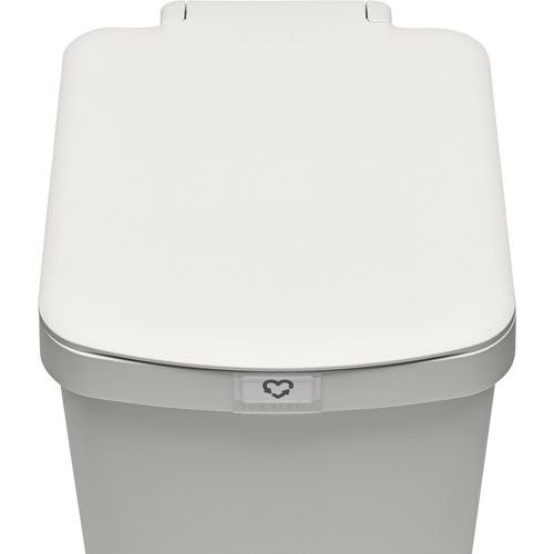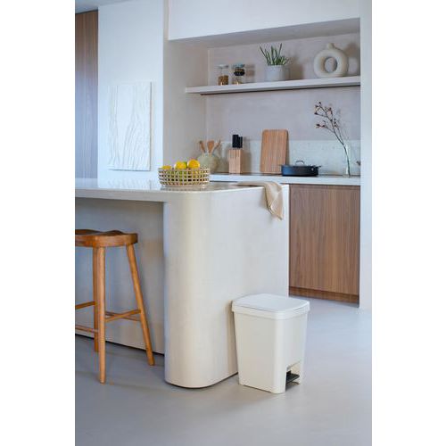 Poubelle circulaire à pédale en matière synthétique, composée à 91% de matériaux recyclés et recyclable à 99% après usage. Grâce à la conception étroite, cette poubelle est peu encombrante et pet être serrée étroitement contre le mur. Equipeé d'un couvercle à fermeture silencieuse, d'un porteétiquette pour indiquer le flux de déchets et d'un espace de rangement pratique pour les sacs poubelle. Couvercle à large bord qui maintient le sac hors de vue.