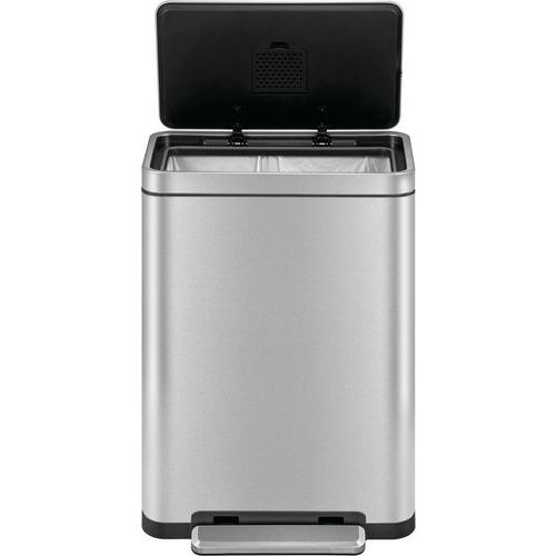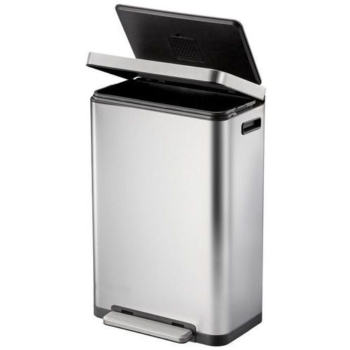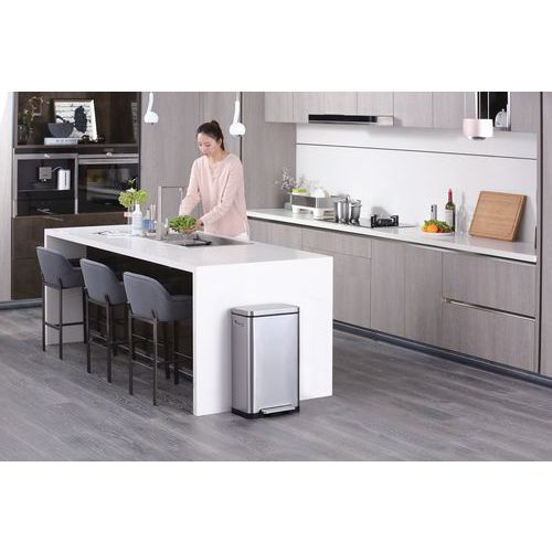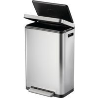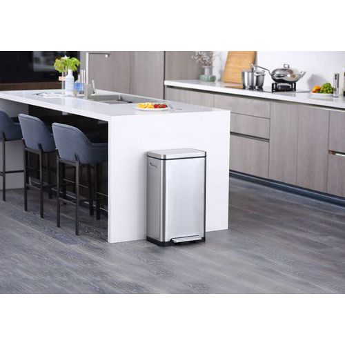 Poubelle élégante rectangulaire équipée d'une pédale extra-large, d'un liner en matière synthétique, d'un couvercle à fermeture silencieuse et de la fonction 'stay-open'.