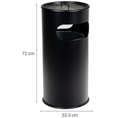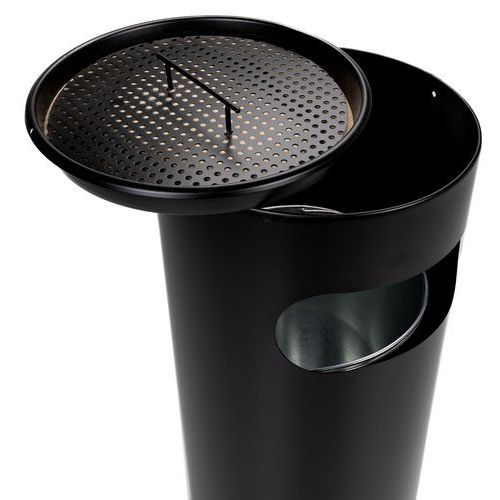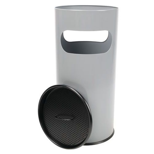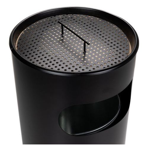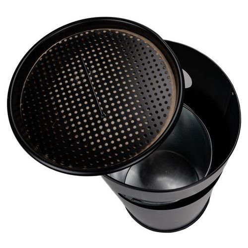 Poubelle-cendrier anti-feu ronde avec liner en métal. Équipée d'un tamis et d'une plaque noire. Grille qui éteindra le mégot facilement. Poignée sur le haut pour facilité la vidange.