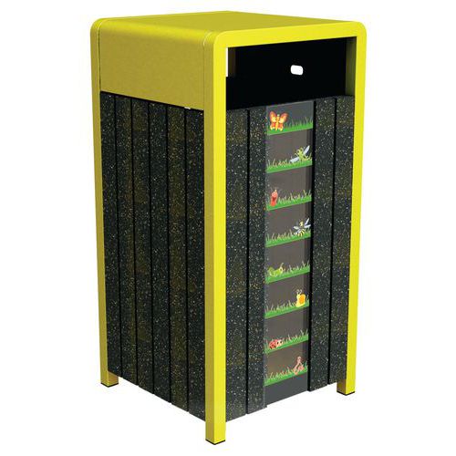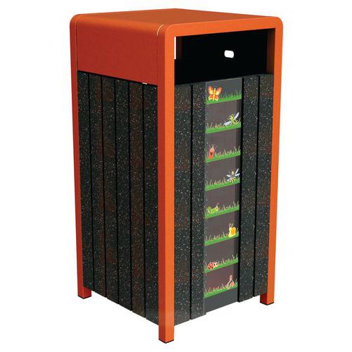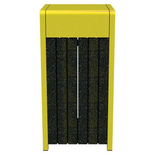 Poubelle Chardonnay avec visibilité du niveau de remplissage. En Ipra, matière produite à partir de plastiques multi composants. Résistance au gel, à la mousse, aux UV, lisse sans risque d'écharde, traitement anti tags, nettoyage à l'eau. Structure aluminium laqué : métal léger qui a une grande résistance à la corrosion. Sans entretien, sans traitement, imputrescible, avec une durée de vie accrue par rapport aux modèles en bois et en plastiques. Garantie 25 ans sur l'Ipra, 10 ans sur l'alu Fabrication à partir de matières recyclées : canettes, pots de fleurs, aluminium… Classement au feu M4. Kit de fixation fourni. Livré monté