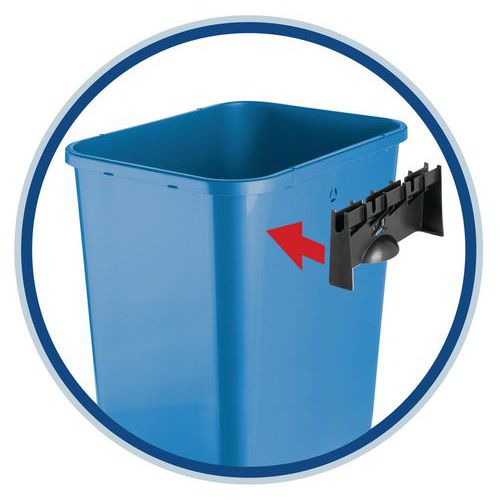 Poubelle de tri sélectif des déchets (papier, plastique, verre, biodéchets). Forme rectangulaire pour un empâtement minimal. . Couvercle avec deux systèmes d’ouverture : par pression ou à bascule. . Système d’accroche fourni. Permet de composer un îlot.. Accepte les sacs poubelle de 50L. Disponible en divers coloris.