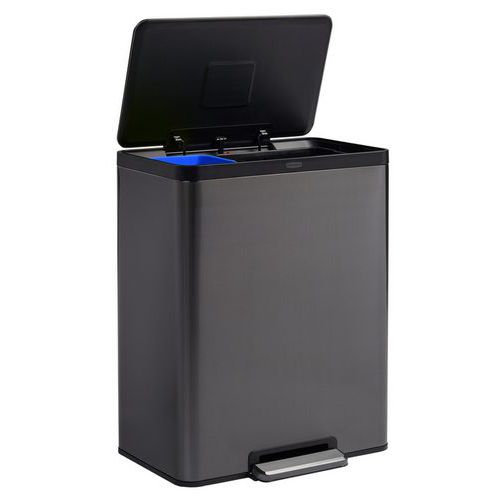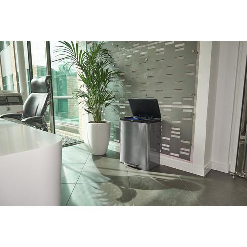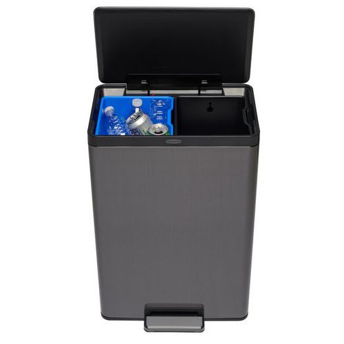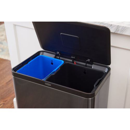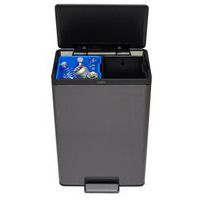 - La poubelle à pédale Elite™ en acier inoxydable, avec compartiments pour déchets et recyclage, offre une solution élégante pour gérer les déchets .