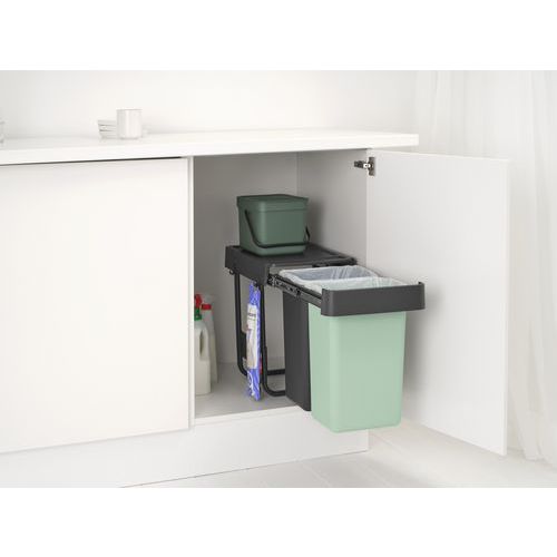 Doublez votre capacité de tri des déchets, sans perdre d'espace au sol avec les poubelles encastrables Brabantia Sort - Go 2 x 15 litres. Conçues pour se cacher dans le placard, avec un cadre de montage facile à installer (autoportant, donc pas de portes qui tombent !). Ces poubelles discrètes s'intègrent dans la plupart des placards de cuisine dont la porte s'ouvre par la gauche ou la droite. Elles possèdent même un espace de rangement sur le dessus et des crochets sur le coté pour une meilleure organisation.