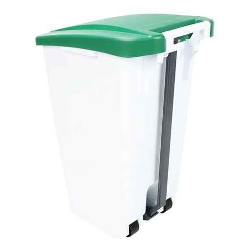 Poubelle mobile maniable grâce à ces 2 roues lisse et sa poignée de transport. Tri sélectif grâce aux couvercles de couleurs. Facile à nettoyer et large pédale. Fabriqué en UE HACCP Garantie client : 10 ans