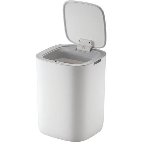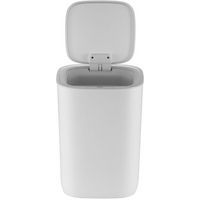 Poubelle carrée tendance en matière synthétique, équipée d'un capteur et touche switch pour ouvrir le couvercle avec un simple geste.