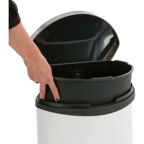 Poubelle à pédale unique grâce à sa forme coquille. Elle est munie d'un couvercle soft closing et liner en plastique. Finition anti-traces de doigts.