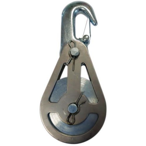 Design compact et robuste. Utilisation simple : ouverture pour positionner ou retirer le câble sans décrocher la poulie. L'adjonction d'un guide-câble embouti dans les flasques en tôle d'acier améliore la longévité du câble en l'obligeant en permanence à descendre dans la gorge. Version avec crochet émerillon (force 200 ou 500 kg) ou crochet tournant avec linguet de sécurité (force 1000 à 5000 kg).