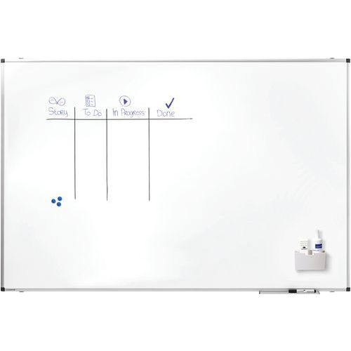 Surface en acier laqué. Surface pour écrire avec marqueur. Cadre en aluminium avec coins en plastique gris foncé. Porte-marqueurs de 30cm. Fixation murale aisée avec fente dissimulée. Possibilité de montage horizontal ou vertical. Fourni avec matériel de montage, auget et marqueur.