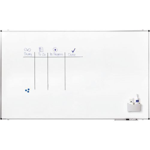 Surface en acier laqué. Surface pour écrire avec marqueur. Cadre en aluminium avec coins en plastique gris foncé. Porte-marqueurs de 30cm. Fixation murale aisée avec fente dissimulée. Possibilité de montage horizontal ou vertical. Fourni avec matériel de montage, auget et marqueur.