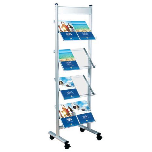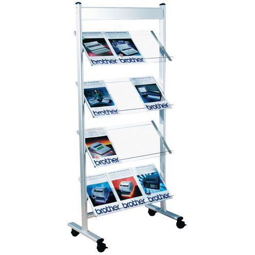 Présentoir pour brochures avec cadre en acier. Équipé de 4 doubles roulettes pivotantes avec frein. Tablettes en verre acrylique de qualité supérieure.