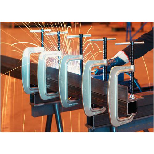 Patin de serrage fixe rainuré pour une accroche parfaite. Presse en C sécurisée par une rotule mobile à la vis. Corps zingué contre la corrosion. Tête de vis monobloc pour une stabilité optimale de l’outil. Fermeture de vis à 0 pour une capacité de serrage maximale.