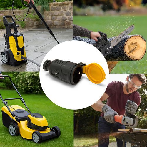 Prise femelle 220V avec contact de terre, adaptée aux connexions sécurisées en extérieur, sur les chantiers et dans les ateliers.