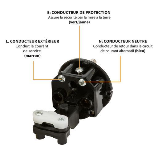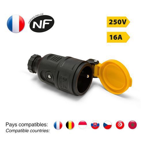 Connecteur français 2P+T, protection IP44, idéale pour une utilisation extérieure et professionnelle.
