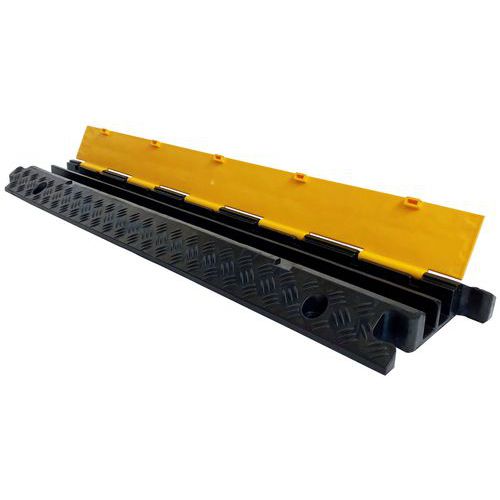Passe-câbles permettant de protéger les câbles et tuyaux lors d'une utilisation temporaire. Fabriqué en caoutchouc avec un couvercle en thermoplastique jaune pour plus de visibilité. Résiste au passage de véhicules jusqu'à 15T par essieu. Se transporte et s'imbrique facilement grâce à sa poignée et à ses queues d'arondes inversées puis se fixe avec 4 points de fixation. Possibilité de le compléter avec des angles, intersection et embout.