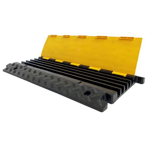 Passe-câbles permettant de protéger les câbles et tuyaux lors d'une utilisation temporaire. Fabriqué en caoutchouc avec un couvercle en thermoplastique jaune pour plus de visibilité. Résiste au passage de véhicules jusqu'à 15T par essieu. Se transporte et s'imbrique facilement grâce à sa poignée et à ses queues d'arondes inversées puis se fixe avec 4 points de fixation. Possibilité de le compléter avec des angles, intersection et embout.