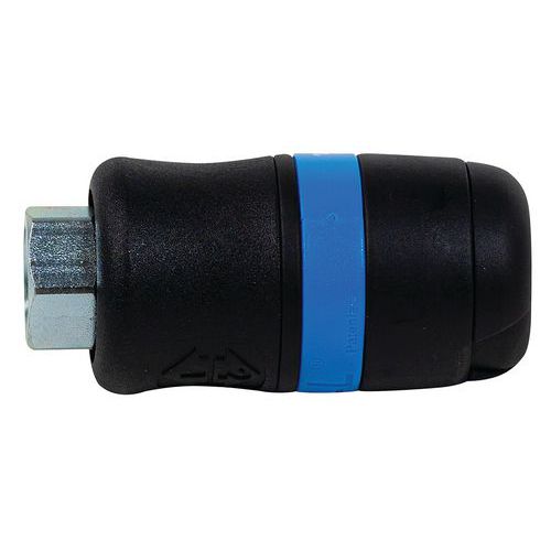 Raccord rapide de sécurité. Raccord automatique à bague utilisant un système d’accroche haute qualité. Effort d’accouplement minimum, étanchéité optimale. Design du corps « G » pour une excellente prise en main. Corps en matériau composite : très léger, résiste à l’abrasion, aux chocs, à l’écrasement et aux vibrations. Préserve les surfaces fragiles de tout risque de rayure (carrosserie, meuble...). Fabriqué sans silicone. Profil ISO 6150 B. Ø passage : 6 mm. Sortie tuyau : 8 mm. Débit : 833 l/min. Pression max : 16 bar.
