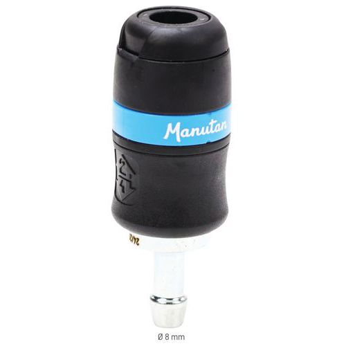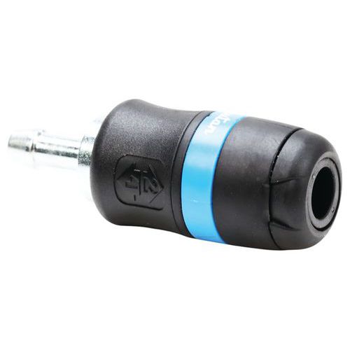 Raccord rapide de sécurité. Raccord automatique à bague utilisant un système d’accroche haute qualité. Effort d’accouplement minimum, étanchéité optimale. Design du corps « G » pour une excellente prise en main. Corps en matériau composite : très léger, résiste à l’abrasion, aux chocs, à l’écrasement et aux vibrations. Préserve les surfaces fragiles de tout risque de rayure (carrosserie, meuble...). Fabriqué sans silicone. Profil ISO 6150 B. Ø passage : 6 mm. Sortie tuyau : 8 mm. Débit : 833 l/min. Pression max : 16 bar.